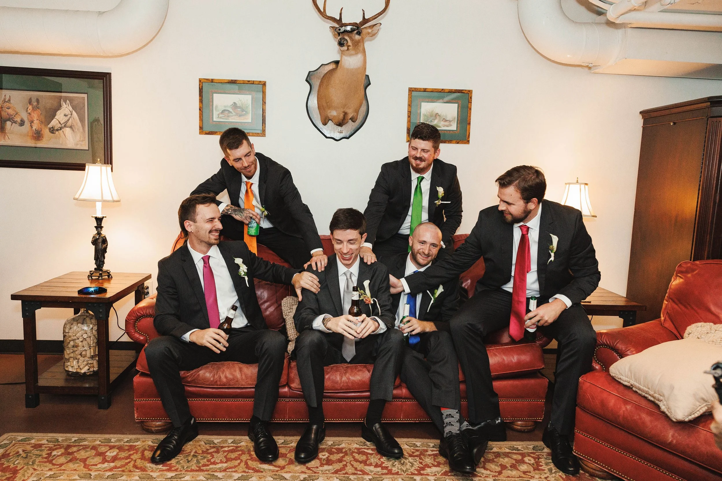 Tucked away on the lower level, the Groom’s Den offers a private, lounge-inspired retreat designed for easygoing moments and good company before the celebration begins. With rich details and the relaxed feel of a classic cigar lounge, the space invites you to unwind, gather your crew, and settle into the day at your own pace. A private bath, large-screen TV, Golden Tee game, and direct access to outdoor cornhole create the perfect blend of comfort and entertainment. It’s a cool, laid-back hideaway where laughter comes easy, stories are shared, and the anticipation of the day ahead sets in.